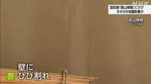 岐阜県飛騨地方を震源とする地震が発生し、高山市で最大震度4を観測しました。この地震により、高山市にある国の史跡「高山陣屋」の壁に複数箇所でひび割れが確認されています。県は地震の影響とみて調査を進めていますが、建物が倒壊する恐れはないとのことです。専門家と修理の可否を検討するとのことです。富山市などでも震度2を観測しましたが、津波の心配はありません。