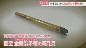 世界遺産である沖ノ島から出土した国宝「金銅製矛鞘」の内部調査で、鉄製の矛に類例のない豪華な象嵌装飾が施されていることが判明しました。金が使用された可能性が高く、東アジアでも唯一の事例とみられています。この発見は、当時の大和政権が沖ノ島での祭祀を非常に重視していたことを示唆しており、祭祀の解明に重要な手がかりとなると期待されています。宗像大社で特別展示が予定されています。