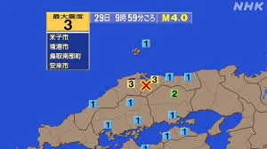 2024年5月29日午前9時59分ごろ、島根県東部を震源とするマグニチュード4.0、深さ約10キロの地震が発生しました。この地震で、鳥取県米子市、境港市、南部町、および島根県安来市で震度3の揺れを観測しました。その他、岡山県、広島県、香川県などでも震度1から2の揺れが観測されています。気象庁によると、この地震による津波の心配はありませんでした。各地で大きな被害は確認されておらず、交通機関への影響も報じられていません。地震発生後、自身の安全確認や情報収集のため、多くの人が地震関連情報を検索し、高い関心を示しました。