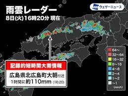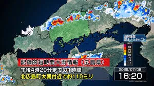 広島県北広島町大朝付近で、2025年7月8日午後4時20分までの1時間に約110ミリの猛烈な雨が解析され、気象庁は「記録的短時間大雨情報」を発表しました。この情報は、数年に一度程度しか発生しないような短時間の大雨が観測・解析された際に発表されるもので、災害の危険が差し迫っていることを意味します。同様に、同日午後4時30分には島根県邑南町付近、午後5時30分には広島県三次市布野町付近、午後5時50分には三次市三次付近でも約110ミリから120ミリの猛烈な雨が解析され、同様の情報が発表されています。これにより、低い土地の浸水、河川の増水や氾濫、土砂災害などが発生する危険が高まっており、気象庁は住民に対し、安全確保や自治体からの避難情報に留意し、早めの避難行動を呼びかけています。中国地方では湿った空気の流れ込みと気温上昇により大気の状態が非常に不安定となっており、引き続き警戒が必要です。