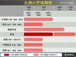 台風5号「ナーリー」が日本列島に大きな影響を与えています。関東に接近後、東北の三陸沖を北上しており、明日未明から明け方にかけて北海道に上陸する恐れがあります。北海道への台風上陸は2016年の11号以来となる可能性があります。これにより、東北の太平洋側や北海道東部では雨や風が強まり、高波やうねりを伴う大しけとなる地域もあります。関東でも、台風から変わる低気圧や湿った空気の影響で、16日にかけて断続的に激しい雨が予想され、特に甲信や関東南部では大雨による浸水、河川の増水・氾濫、土砂災害への厳重な警戒が呼びかけられています。また、台風とは別の低気圧や前線の影響で、西日本や東海地方でも局地的に非常に激しい雨が降る見込みで、線状降水帯の発生にも警戒が必要です。日本全体で広い範囲で気象への注意が促されており、本格的な台風シーズンの到来を告げる形となっています。国民は「明日の天気」に大きな関心を寄せ、最新の気象情報を確認しています。