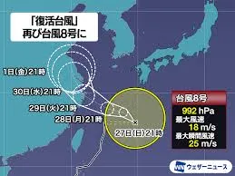 台風8号が熱帯低気圧に変わった後、7月27日午後9時に那覇市の東約190kmの海上で再び台風に再発達し、「復活台風」となりました。これは2018年の台風28号以来7年ぶりの珍しい現象です。中心気圧は992ヘクトパスカル、最大風速18m/sで、ほとんど停滞しています。沖縄本島や奄美付近を通過し、28日にかけて東シナ海へ進むと予想されていますが、この影響で沖縄・奄美では大気の状態が非常に不安定になっています。特に大東島地方では28日明け方にかけて線状降水帯が発生するおそれがあり、沖縄・奄美全体で雷を伴う激しい雨や強風、高波、土砂災害、浸水、河川の増水に警戒が必要です。7月としては台風の発生数が多く、本格的な台風シーズンの到来を示唆しています。
