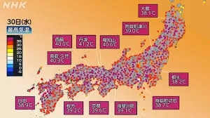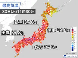 本日30日も日本列島は高気圧に覆われ、広範囲で危険な暑さが続いています。特に西日本から東海、九州地方では午前中から35℃を超える地点が続出し、一部では体温を上回る酷暑を記録。福岡県久留米市や大分県日田市では最高気温40℃が予想されるなど、命に関わるレベルの暑さが見込まれています。その他、熊本、佐賀、京都、岐阜で39℃、秋田、甲府、名古屋、大阪、鳥取で38℃など、各地で猛烈な暑さとなる予測です。この状況を受け、東北から沖縄にかけての33都府県に熱中症警戒アラートが発表されています。屋外での活動は最小限にし、室内でもエアコンの適切な使用、こまめな水分・塩分補給、休憩を徹底するよう強く呼びかけられています。また、自治体が指定するクーリングシェルターの活用も推奨されています。