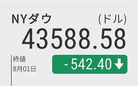 ニューヨーク株式市場でダウ工業株30種平均が大幅に続落し、終値で前日比542ドル安の4万3588ドルとなりました。一時的には800ドル近くまで下落する場面も見られ、5営業日連続の値下がりです。この背景には、米労働省が発表した7月の雇用統計で非農業部門の就業者数の増加が市場予想を下回り、さらに5月と6月分のデータも下方修正されたことで、米景気悪化への懸念が強まったことがあります。また、トランプ前大統領による高関税政策が景気に与える悪影響への警戒感も広がっています。個別銘柄では、業績見通しが市場予想に届かなかったネット通販大手アマゾン・ドット・コムが急落したほか、アップルやエヌビディアといった大手IT企業の株も売られました。
