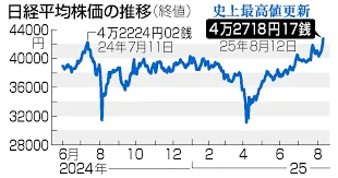 日経平均株価が8月12日に終値で4万2718円17銭を記録し、昨年7月以来約1年1ヶ月ぶりに史上最高値を更新しました。この株高の背景には、日米・米中間の関税を巡る不透明感が和らいだこと、円安の進行による輸出企業の業績期待、そして「FOMO(Fear Of Missing Out)」と呼ばれる、取り残されることへの恐怖から投資家が買いに走る心理が挙げられます。また、海外投資家がアベノミクス期に匹敵する17週連続の買い越しを記録し、米国での早期利下げ期待も相場を押し上げました。株価上昇は企業が資金を集めやすく、将来的に賃金アップにつながる可能性を秘める一方で、市場の過熱感や米国経済の先行き、国内政局の不安定さといった懸念材料も指摘されています。トレンドワードの「フジクラ株価」は、AIデータセンター需要の拡大を背景に、個別銘柄として高い上昇率を記録している銘柄の一つとして注目されています。