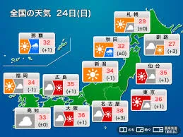 8月24日(日)は、東日本を中心に猛烈な残暑が続き、各地で体温を超えるような危険な暑さに見舞われました。福島県から沖縄県にかけて37の都府県に熱中症警戒アラートが発表され、熱中症への厳重な警戒が呼びかけられました。特に、岐阜市や前橋市、埼玉県熊谷市では38度、東京都心や京都市、名古屋市などでも37度が予想されるなど、35度以上の猛暑日となる地点が続出しました。一方、東北北部では午前中を中心に強雨や雷雨の恐れがあり、西日本でも雲が広がりやすく、にわか雨や雷雨の可能性がありました。午後には山沿いを中心にゲリラ雷雨の発生も懸念され、場所によっては土砂災害や低い土地の浸水にも注意が必要な一日となりました。