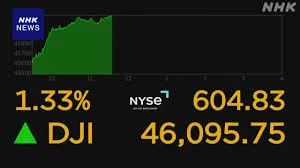 11日のニューヨーク株式市場でダウ平均株価が史上初めて4万6000ドルを突破し、終値でも4万6108.00ドルと過去最高値を更新しました。この大幅な株価上昇の背景には、いくつかの要因があります。まず、同日に発表された8月の米消費者物価指数(CPI)がほぼ市場予想通りの内容だったこと。加えて、新規の失業保険申請件数が増加し、労働市場の減速が改めて意識されたことで、FRB(連邦準備制度理事会)が来週の会合で利下げに踏み切るとの見方が一段と強まりました。利下げへの期待が高まったことで、投資家の買い注文が優勢となり、幅広い銘柄に波及。ダウ平均は一時600ドルを超える値上がりを見せました。また、ハイテク株が中心のナスダック総合指数も4日連続で最高値を更新しており、市場全体が活況を呈しています。金利低下も株式相場を支える要因となっています。