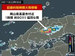 岡山県高梁市付近で、11日22時30分までの1時間に約90ミリという猛烈な雨が降り、「記録的短時間大雨情報」が発表されました。これは数年に一度しか発生しないような短時間の大雨で、災害発生につながる稀な雨量であることを示しています。この大雨により、同市では土砂災害や低い土地の浸水、川の増水への警戒が呼びかけられました。 さらに、大雨の影響で、高梁市備中町西山の一部地域では、11日夜遅くから固定電話約100回線が不通となる深刻な被害が発生しています。NTT西日本によると、土砂崩れによる通信ケーブルの損傷や電柱の倒壊が原因で、この地域では携帯電話もつながりにくい状況が続いています。復旧の見通しは現時点では立っておらず、住民生活への影響が懸念されています。