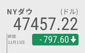 13日のニューヨーク株式市場で、NYダウ工業株30種平均が前日比797ドル安の4万7457ドルと大幅に急落しました。これに続き、テクノロジー株主導でナスダック総合株価指数も2%の大幅安となりました。この急落の主な背景には、これまで急激に上昇していた大手テック株(テスラ、エヌビディアなど)の割高感からの利益確定売りと、米連邦準備理事会(FRB)による12月の追加利下げ観測の後退があります。FRB高官がインフレ抑制のため金融引き締め姿勢の維持が必要だと示唆したことで、金利先物市場での利下げ確率が大きく低下しました。この米株安を受けて、東京市場でも日経平均株価が大幅に反落し、節目の5万円を割り込む可能性も指摘されており、特に半導体やAI関連株を中心に売りが優勢となる見込みです。