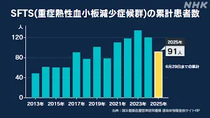 マダニが媒介する「重症熱性血小板減少症候群(SFTS)」の感染が全国的に拡大し、死者が相次いでいます。国立健康危機管理研究機構によると、2025年の感染者数は6月末までに91人となり、過去最多だった2023年の同時期を上回るペースです。SFTSは致死率が1割から3割に及び、愛知、静岡、香川、宮崎などで死亡例が報告されています。岐阜県では初の感染確認がありました。