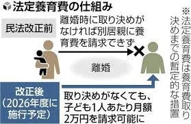 法務省は、離婚後の子どもの生活を支える新たな制度として、「法定養育費」を来年4月1日から導入することを決定しました。これは、離婚時に父母間で養育費の取り決めがなくても、子ども1人あたり月額2万円を暫定的に請求できる制度です。離婚後の共同親権導入に合わせて設けられ、子どもの最低限の生活を確保することを目的としています。