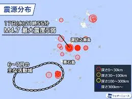 鹿児島県十島村のトカラ列島・諏訪之瀬島で17日夜、震度5弱の地震が発生し、その後も有感地震が続いています。19日にも震度4の地震を観測しました。島民は「今までとは違う横揺れ」に不安を感じており、学校では児童生徒の安全確保のためヘルメット着用を義務付けるなどの対応をとっています。現時点でけが人や建物、ライフラインへの大きな被害は報告されていませんが、島民の心労が心配されています。気象庁は今回の地震を火山性地震とみており、専門家は2019~2020年に噴火活動が活発化した際と同じ震源であることから「マグマ活動によって引き起こされた地震」と分析しています。今後1週間程度は震度5弱程度の地震に注意が必要で、火山活動の動向も引き続き注視されています。