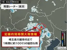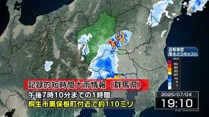 2025年7月4日と5日にかけ、埼玉県川越市付近と群馬県桐生市黒保根町付近で「記録的短時間大雨情報」が相次いで発表されました。これは、数年に一度しか発生しないような猛烈な雨が短時間に降ったことを示すもので、埼玉県川越市付近では約100ミリ、群馬県桐生市黒保根町付近では約110ミリの雨が観測されています。この情報は、土砂災害や低い土地の浸水、河川の増水など、重大な災害が発生する危険が極めて高まっていることを意味します。気象庁は、地元自治体の避難情報に留意し、ただちに身の安全を確保するよう強く呼びかけており、警戒レベル4以上に相当する状況として厳重な警戒が求められています。