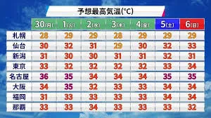 6月最終週、全国的に記録的な猛暑に見舞われ、6月30日には全国914地点中100地点で最高気温が35℃以上の猛暑日を観測しました。これは2022年以来3年ぶりの事態です。特に東海地方では、名古屋で6月として過去最多となる4日目の猛暑日を記録し、岐阜県多治見市では37.4℃、下呂市萩原では36.8℃と、6月の観測史上最高気温を更新した地点もありました。この危険な暑さにより、愛知県の観光農園では、通常は時期をずらして咲くヒマワリが猛暑で一斉に満開になるという想定外の事態が発生し、通常不要な水やりも必要になっています。日本気象協会によると、東海地方の梅雨明けは7月上旬の見込みで、今後も体温を超える危険な暑さが続くと予想されています。「京都 天気」の検索トレンドは、この全国的な猛暑の中で、特定の地域における具体的な気象状況や熱中症への注意喚起の必要性が高まっていることを示しています。人々が自身の健康や生活に直結する情報を求めている状況です。