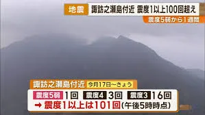 鹿児島県トカラ列島近海、特に悪石島や諏訪之瀬島周辺で地震活動が活発化しています。9月17日には諏訪之瀬島で最大震度5弱を観測する地震が発生し、その後も震度1以上の地震が断続的に発生しており、24日までに100回を超えました。震度4の揺れも3回、震度3も16回観測されています。気象台は、9月17日の諏訪之瀬島での震度5弱の地震を火山性の地震と判断しており、6月から悪石島を中心に発生している群発地震とは異なるものと見ています。現在のところ、けが人や建物の被害、ライフラインへの影響は報告されていませんが、今後も震度5弱程度の地震が発生する可能性があり、警戒が呼びかけられています。住民の方々は、引き続き地震情報に注意し、安全を確保するよう促されています。