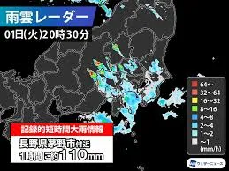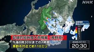 2025年7月1日午後8時30分頃、長野県茅野市付近で1時間に約110ミリの猛烈な雨が降ったとみられ、気象庁は「記録的短時間大雨情報」を発表しました。この情報は、数年に一度しか発生しないような短時間での猛烈な雨を観測・解析した際に発表されるもので、災害発生の危険が極めて高いことを意味します。茅野市では、この大雨により土砂災害、低地の浸水、洪水災害の危険度が急激に高まっており、すでに重大な災害が発生している可能性も指摘されています。気象庁や地元自治体は、住民に対し、安全を確保するため、避難に関する情報に留意し、早めの避難や、キキクル(危険度分布)で自身の場所の危険度を確認するよう強く呼びかけています。