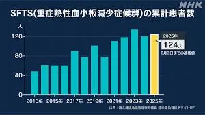 マダニが媒介する感染症「SFTS(重症熱性血小板減少症候群)」の患者数が、今年に入り過去最多のペースで増加しています。国立健康危機管理研究機構によると、8月上旬の時点で全国の患者数は去年1年間の累計を上回り、過去最多だったおととしの同時期よりも報告数が多くなっています。これまでは西日本が中心でしたが、今年は北海道、茨城県、栃木県、神奈川県、岐阜県など、これまで感染が確認されていなかった地域でも初めて患者が報告され、全国的な広がりを見せています。SFTSは、発熱や倦怠感、嘔吐、下痢などの症状が現れ、重症化すると致死率が約27%にもなる深刻な病気です。ペットからの感染例も報告されています。このような状況を受け、厚生労働省は「山ありダニあり」といったユーモラスなポスターを通じて、農作業や登山などで草むらに入る際の長袖・長ズボン着用など、マダニに刺されないための具体的な予防対策を呼びかけています。