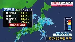 梅雨前線が本州付近に停滞し、さらに台風2号から変わる熱帯低気圧が北上している影響で、西日本を中心に激しい雨が続いています。特に、24日(火)は九州北部や中国地方で強い雨が観測され、長崎県長浦岳で25.5mm、佐賀県伊万里市で24.5mmなど、局地的に激しい雨となりました。25日(水)にかけても、この熱帯低気圧が伊豆諸島付近を北上するため、九州から関東の広い範囲で雨が強まる見込みです。特に九州北部や中国地方では、大雨による土砂災害や河川の氾濫に厳重な警戒が呼びかけられています。また、東日本、特に関東でも湿った空気が流れ込み、一日を通して雨が強まる可能性があるため、道路冠水や河川の急な増水に十分な注意が必要です。引き続き、最新の雨雲レーダーなどの気象情報で状況を確認することが重要です。
