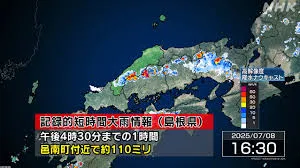 広島県北部では、7月8日に大気の状態が非常に不安定となり、三次市や北広島町大朝を中心に大雨となりました。広島地方気象台によると、北広島町大朝では1時間雨量が観測史上最大の59.0ミリを記録。三次市では洪水や土砂崩れの恐れから、布野・八次・十日市・酒屋地区の計1万466世帯2万1763人に避難指示が出されました。隣接する島根県邑南町でも、同日午後4時30分までの1時間に約110ミリの猛烈な雨が降り、「記録的短時間大雨情報」が発表され、倒木による県道の通行止めも発生しました。その後、三次市と庄原市に出されていた土砂災害警戒情報は、大雨の弱まりとともに解除されました。
