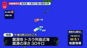 2025年6月30日午後6時33分ごろ、トカラ列島近海を震源とするマグニチュード5.1、最大震度5弱の地震が発生しました。鹿児島県十島村悪石島で強い揺れを観測しましたが、津波の心配はありませんでした。しかし、この地域では6月21日から地震活動が活発化しており、6月30日午後9時までに震度1以上を観測した地震はすでに684回に上っています。悪石島の住民からは「突き上げて横揺れを感じた。今夜は眠れない」といった不安の声が聞かれ、連日の揺れで精神的な負担が増している状況です。気象台は、当分の間、震度5弱程度の地震に注意を呼びかけるとともに、地盤の緩みによる落石やがけ崩れ、特に雨による土砂災害への警戒を促しています。現時点では大きな被害報告は入っていません。