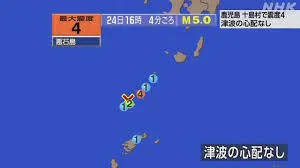 鹿児島県トカラ列島近海では、6月21日早朝から地震活動が活発化しており、24日午後4時4分頃には十島村悪石島で震度4、マグニチュード5.0の地震が発生しました。この活発な地震活動により、24日午後3時までに震度1以上の地震が330回以上(一部報道では327回、332回など)観測されており、そのうち震度4の揺れは複数回(22日午後5時15分にもマグニチュード5.1、震度4の地震)発生しています。特に悪石島では24日未明にも震度4を観測し、3日連続で強い揺れが続いています。気象庁によると津波の心配はなく、現在のところ人的・物的被害は確認されていません。この地域は過去にも群発地震が頻繁に発生しており、2021年12月には悪石島で震度5強を観測した例もあります。鹿児島大学の専門家は、過去の事例から今回の地震活動も数日から1週間程度活発な期間が続く可能性を指摘し、今後の地震への注意を呼びかけています。また、「トカラ列島での地震が国内の大地震に繋がる」というSNSでの情報拡散については、科学的根拠がないとの見解が示されています。