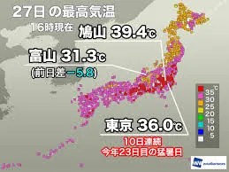 東京都心では27日に36.0℃を観測し、10日連続の猛暑日を記録。これは観測史上最長記録であり、年間の猛暑日日数も23日で最多を更新しました。関東の内陸部でも39℃を超える危険な暑さが報告されており、8月最後の週末には体温を超える40℃に迫る地域も出る可能性があります。