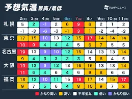 また、全国的に気温が急激に低下し、特に西日本や東日本では最高気温が10℃前後の真冬並みの寒さとなるでしょう。週後半には都市部でも5℃以下まで冷え込む日が増えるため、万全の防寒対策が必須です。週末には寒さが和らぐ見込みですが、それまでは最新の気象情報・交通情報に注意が必要です。