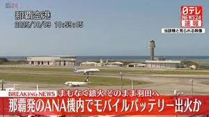 9日午前11時頃、那覇空港を離陸し羽田空港へ向かっていた全日空994便(ボーイング787-10型機、乗客乗員356人)の機内で、乗客の手荷物に入っていたモバイルバッテリーから発煙するトラブルが発生しました。発煙は、座席下のカバン内にあったリチウムイオン電池内蔵のモバイルバッテリーからで、離陸後間もなくのことでした。幸い、近くにいた乗客が持っていた飲料水を使ってすぐに消し止められ、けが人はありませんでした。このトラブルによる運航への支障はなく、同機は予定通り羽田空港に到着しました。国土交通省はモバイルバッテリーの発火事故が相次いでいることを受け、今年7月から機内持ち込み時の保管方法について、座席上の収納棚ではなく手元で保管するよう求めていました。