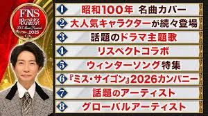 年末の風物詩である「FNS歌謡祭」は、その時期的な話題性に加え、豪華な出演アーティスト陣が最大の魅力です。特に、世代を超えた「昭和100年名曲カバー」企画や、普段見ることのできないアーティスト同士のスペシャルコラボレーションが視聴者の期待感を大きく高めています。また、J-POPからK-POP、アイドル、ベテランまで幅広いジャンルのアーティストが揃い、多様な音楽ファンが楽しめる構成になっているため、大きな注目を集めています。