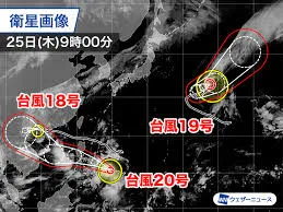 現在、台風18号、19号、20号の3つの台風が同時に存在し、「トリプル台風」として注目を集めています。気象庁によると、台風18号(ラガサ)は既に熱帯低気圧に変わり、中国華南方面へ進んでいます。台風19号(ノグリー)は日本のはるか東で西へ進んだ後、Uターンする複雑な動きが予測されていますが、日本列島への直接的な影響はない見込みです。小笠原諸島では週末にかけて波が高くなる可能性があります。一方、台風20号(ブアローイ)は強い勢力でフィリピンに接近しており、その後南シナ海に進む見込みで、こちらも日本への影響はありません。9月は平年で最も台風の上陸数が多い時期であり、引き続き最新の気象情報に注意し、日頃からの備えが重要だと呼びかけられています。トリプル台風は今年3回目であり、珍しいことではありませんが、気象状況への関心が高まっています。