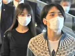 搭乗口に向かう小室圭さん(右)と小室眞子さん(2021年撮影)
