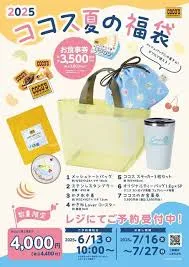 ココスが2025年夏の福袋の予約販売を6月13日から開始します。価格は4400円で、3500円分の食事券に加え、しろくまデザインの巾着、ステンレスタンブラー、コースター、メッシュトートバッグ、ステッカーセット、オリジナルティーバッグの計6点のオリジナルグッズがセットになっています。予約は店頭のみで、7月16日から27日に受け取り可能です。