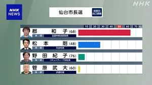 仙台市長選挙が8月3日に投開票され、現職の郡和子氏(68)が新人3人を退け、3期目の当選を確実にしました。郡氏は選挙戦で、全国一律の出産育児一時金への独自上乗せや、18歳までの医療費ゼロ化といった子育て支援の拡充を重点政策として掲げ、経済回復や賑わい創出、大型イベント誘致などにも力を入れると訴えました。政党の推薦は受けなかったものの、自民、公明、立憲民主各党の市議や連合宮城からの支援に加え、無党派層からも幅広く支持を集めました。投票率は午後6時時点で20.22%と前回より上昇し、期日前投票も前回の1.7倍に増えるなど、市民の市政への関心の高さが示されました。郡氏は当選後、「未来の仙台市民が誇らしく思うような街にしていきたい」と抱負を述べています。