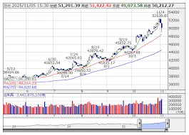 日経平均株価が大幅に続落し、一時5万円の大台を割り込む展開となりました。下げ幅は一時2400円を超え、終値も前日比2.5%安の5万0212円27銭を記録。背景には、米国市場でのハイテク株、特にAI関連銘柄の割高感からの売りが加速したことがあります。金融大手の経営者による株価調整の警告や著名投資家による弱気ポジション開示も投資家心理を悪化させました。日本市場ではソフトバンクグループやアドバンテストなどの半導体・AI関連主力株が大きく下落。リスク回避の動きから債券は買いが先行しましたが、弱い10年債入札結果を受け上げ幅を縮小。円相場は一時円高に振れるも、その後は小幅上昇に戻しました。市場では一時的な調整との見方がある一方、数日は難しい地合いが続く可能性も指摘されています。しかし、好決算銘柄には買いが入るなど、全面安ではない側面も見られました。
