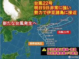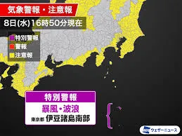 非常に強い台風22号(ハーロン)が日本の南海上を北上し、10月8日夜から9日朝にかけて伊豆諸島に最接近する見込みです。気象庁は、東京都の伊豆諸島に対し、暴風と波浪の特別警報を発表する可能性があると警告しています。八丈島や青ヶ島など伊豆諸島南部では、最大瞬間風速70m/sに達する建物損壊レベルの猛烈な風が吹き荒れ、波の高さは10m前後の大しけが予想されます。また、9日夜までに八丈島で300mm前後の大雨が予測され、土砂災害や浸水、高潮にも厳重な警戒が必要です。八丈島では既にスーパーで生鮮食品などが品薄となり、住民は窓に板を打ち付けるなど、例年以上に厳重な対策を講じています。関東の沿岸部でも強風や高波への注意が呼びかけられています。