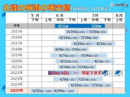 気象庁が今年度の梅雨入り・梅雨明けの確定値を発表し、速報値から大幅な見直しが行われたことが話題になっています。全国的に梅雨入りが速報値より前倒しされ、特に西日本から北陸では5月中に梅雨入りし、6月終わりまでに梅雨明けした地域が多数ありました。沖縄や奄美では速報値よりも11日早い5月上旬が梅雨入りと確定し、九州南部よりも早かったことが判明。北陸地方では、梅雨入り・梅雨明けともに統計史上最も早い記録となり、6月中の梅雨明けは史上初でした。
