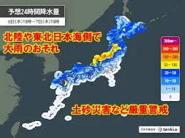 明日8月7日(木)は、日本海を進む低気圧と前線の影響で、沖縄を除くほぼ全国的に雨が降る見込みです。特に北陸や東北の日本海側では、暖かく湿った空気と上空の寒気の影響で大気の状態が非常に不安定となり、線状降水帯が発生する恐れがあります。新潟県、富山県、石川県では、6日夜遅くから7日朝にかけて線状降水帯が発生し、大雨災害の危険度が急激に高まる可能性があります。これまでの降水量も多く、佐渡市羽茂では8月の観測史上最多を記録した地点もあります。7日午後6時までの24時間で、多いところでは8月の平年ひと月分の雨量に匹敵する200ミリの降水量が予想されており、土砂災害、低い土地の浸水、河川の増水や氾濫に厳重な警戒が必要です。九州から関東にかけても局地的に激しい雨が予想され、交通機関への影響や道路冠水の可能性もあります。荒天時には外出を控え、早めの避難を心がけるよう呼びかけられています。
