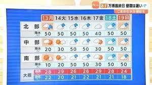 10月13日「スポーツの日」である三連休最終日の滋賀県と近畿地方の天気予報が話題になりました。滋賀県は、南部が「くもり後晴れ」となる一方、北部は「くもり一時雨」の予報でした。近畿地方全体では、台風23号が伊豆諸島方面へ遠ざかる見込みで、近畿中部・南部は天気が回復し晴れ間が広がる予想。しかし、北部では北風の影響で雲が多く、時折雨が降る可能性がありました。日中の最高気温は、中部・南部で27~29℃と10月としては季節外れの暑さとなり、日傘や水分補給などの暑さ対策が呼びかけられました。この日は大阪・関西万博の閉幕日でもあり、屋外での活動を予定している人々にとって、天気情報への関心が高まりました。