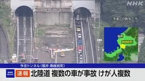 9月26日午前8時半ごろ、福井県南越前町にある北陸自動車道の今庄トンネル内で、トラックや乗用車など合わせて6台が関係する多重事故が発生しました。この事故により、6人が病院に搬送され、うち50代の男性が大けがを負っていますが、いずれも意識はあるとのことです。事故現場の今庄トンネルは、当時工事規制のため上り線が片側1車線の対面通行となっており、警察は対面通行部分で反対車線の車と衝突した可能性があるとみて詳しい状況を調べています。この事故の影響で、北陸自動車道の今庄インターチェンジから敦賀インターチェンジ間の上下線が通行止めとなり、周辺の国道8号でも迂回車両による渋滞が発生しています。通行止め解除のめどはまだ立っていません。