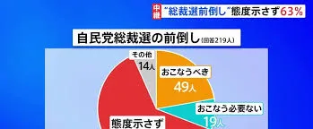 自民党総裁選の前倒し実施の是非が焦点となっています。JNNのアンケートでは、自民党議員の約22%が前倒しを支持しましたが、63%は態度を保留しました。自民党の総裁選挙管理委員会は、臨時の総裁選実施の判断手続きを決定。実施を求める国会議員は署名・捺印した書面を本人が直接提出し、氏名が公表されることになりました。また、都道府県連も正式な機関決定の上で党本部に連絡します。これにより、国会議員295人と47都道府県連の総数の過半数である172に達すれば、臨時総裁選が実施されます。