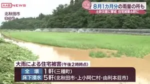 秋田県内で記録的な大雨が続き、「記録的短時間大雨情報」が発表され、広範囲で被害が出ています。特に、三種町では住宅の全壊が確認されたほか、北秋田市、上小阿仁村、由利本荘市など複数の地域で床下浸水を含む住宅被害が計6軒発生しました。また、各地の農地が冠水する被害も報告されています。気象台の観測では、秋田市大正寺で5日の降り始めから250.5mmに達し、これは平年の8月1ヶ月分の雨量を超える記録です。五城目町を流れる内川川が氾濫し、道路が冠水するなどの影響も出ました。土砂災害警戒情報は解除されたものの、これまでの雨で地盤が緩んでいる箇所が多く、引き続き土砂災害や低い土地の浸水、河川の増水・氾濫への厳重な警戒が呼びかけられています。活発な雨雲は断続的に県内に流れ込み、今後も局地的に激しい雨が降る恐れがあり、住民は注意が必要です。