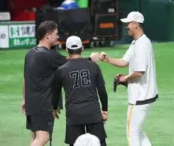 <ソ・巨>試合前、タッチを交わすリチャード(左)と秋広(撮影・岡田 丈靖)