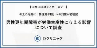 日本たばこ産業(JT)が、社員の更年期障害治療に対し、女性だけでなく男性も対象とした特別休暇(年間最大24日)と治療費補助(上限3万円)の制度を導入しました。退職防止や業務効率低下を防ぐ狙いがあります。同様にCARTA HOLDINGSも、女性向けだった更年期漢方服薬支援制度を全従業員に拡大しています。これらの動きは、男性にも疲労感、めまい、気分の落ち込みといった更年期障害(LOH症候群)の症状があることが社会的に認知され始め、対策の必要性が高まっている背景があります。経済産業省の試算では、男性更年期障害による経済損失が年間1.2兆円にも上るとされ、政府の「経済財政運営と改革の基本方針(骨太の方針)」にも対策が明記されるなど、国を挙げた取り組みが進んでいます。しかしDクリニックの調査では、男性更年期について「理解している」人はわずか12%で、セルフチェックでは68%に疑いがあるという実態が明らかになっています。さらに重度の症状を持つ人は労働生産性が約24ポイント低いとされており、早期発見と適切な治療、そして社会全体の理解向上が急務となっています。