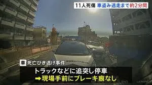 東京都足立区で発生した盗難車の暴走事故に関する続報です。この事故では、盗まれた乗用車が歩道を暴走し、歩行者らを次々とはね、計11人が死傷しました。当初、意識不明の重体だった20代女性が25日に死亡し、先に亡くなった80代男性と合わせて死者は2人となりました。